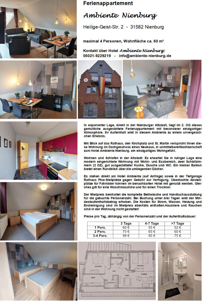In exponierter Lage, direkt in der Nienburger Altstadt, liegt im 2. OG dieses gemütliche ausgestattete Ferienappartement mit besonderer einzigartiger Atmosphäre. Ihr Aufenthalt wird in diesem Ambiente zu einem unvergesslichen Erlebnis.